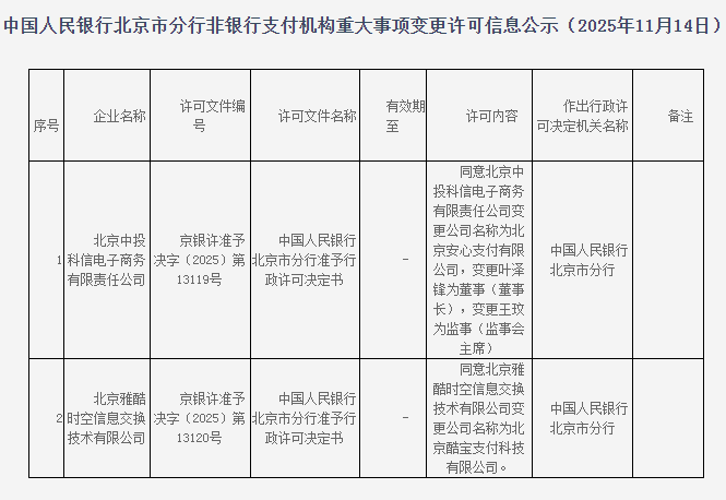 文章來(lái)源:四九八網(wǎng)絡(luò)發(fā)布時(shí)間:2025-11-27 10:46:05熱度:4911月18日,中國(guó)人民銀行北京市分行公示了2家支付機(jī)構(gòu)的重大事項(xiàng)變更許可信息。